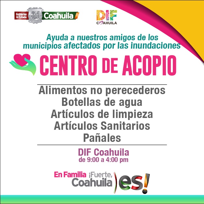 El Gobierno de Coahuila, a través de las coordinaciones del DIF Estatal, habilitó centros de acopio en los que se estarán recibiendo apoyos de la población, principalmente alimentos no perecederos, así como artículos de aseo personal y material de curación, que serán enviados a las personas afectadas por las recientes lluvias en la entidad.