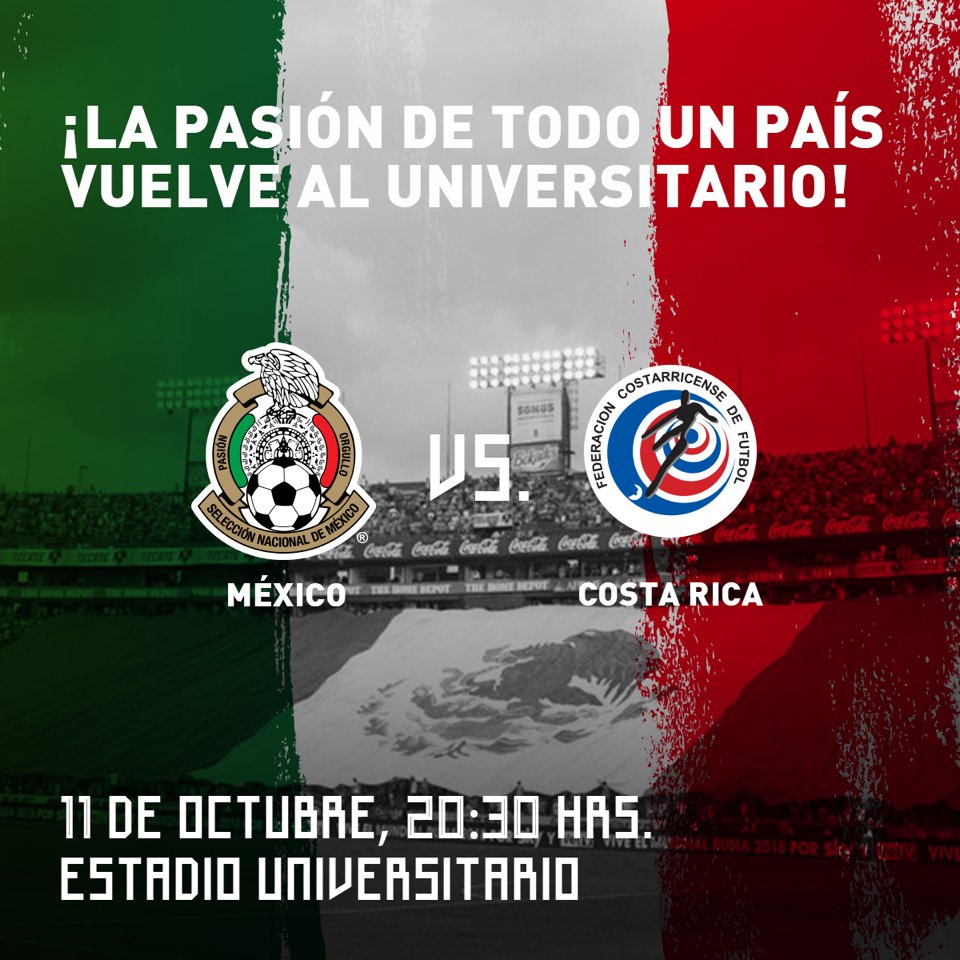La Dirección de Selecciones Nacionales dio a conocer que los próximos rivales de México, en la fecha FIFA de octubre, serán Costa Rica y Chile, los días 11 y 16, en el Estadio Universitario, de Monterrey, y en El Corregidora, de Querétaro, respectivamente, dio a conocer El Heraldo de México.