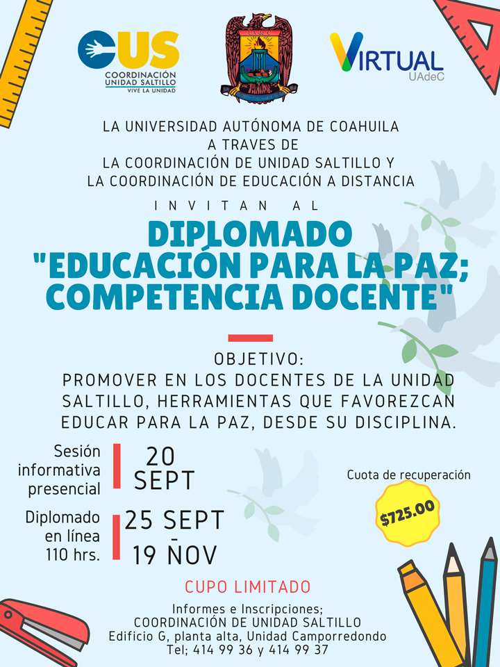 El objetivo del diplomado es promover en los docentes de la Unidad Saltillo, herramientas que favorezcan educar para la paz desde su disciplina, por lo que se convoca a profesores a no perderse la oportunidad de tomar este diplomado, ya que el cupo es limitado, la cuota de recuperación es de 725 pesos.