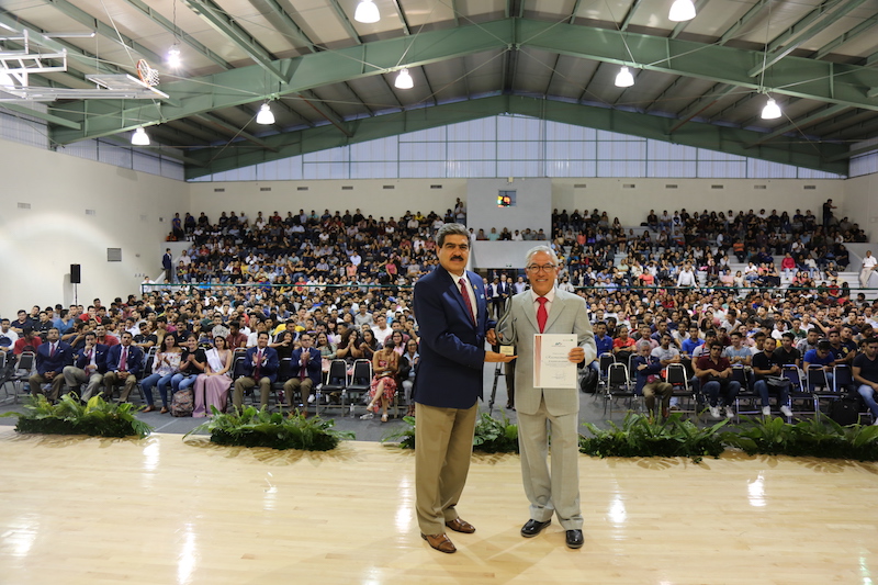 Tras su exposición, Salvador Jara Guerrero recibió una estatuilla de manos del rector Raúl Martínez, quien destacó que era en reconocimiento a su trayectoria dentro del sector de la Educación.