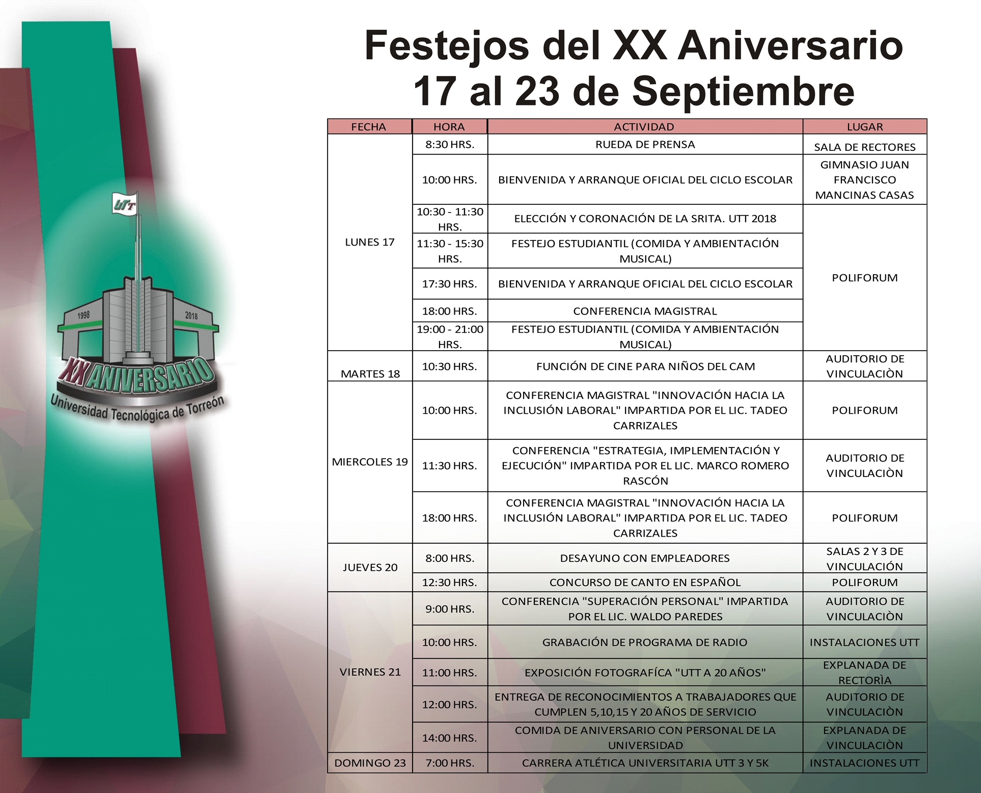 En la Sala de Rectores se dio la conferencia de prensa, el rector Raúl Martínez Hernández dio a conocer los eventos que se tendrán la presente semana del 17 al 23 de septiembre, en la que cada día realizarán actividades en el marco de los 20 años de la UT de Torreón. También agradeció al gobernador Miguel Riquelme, por la inversión en infraestructura para construir dos nuevos edificios en la universidad, que será un Centro de Idiomas y un Laboratorio de última tecnología.