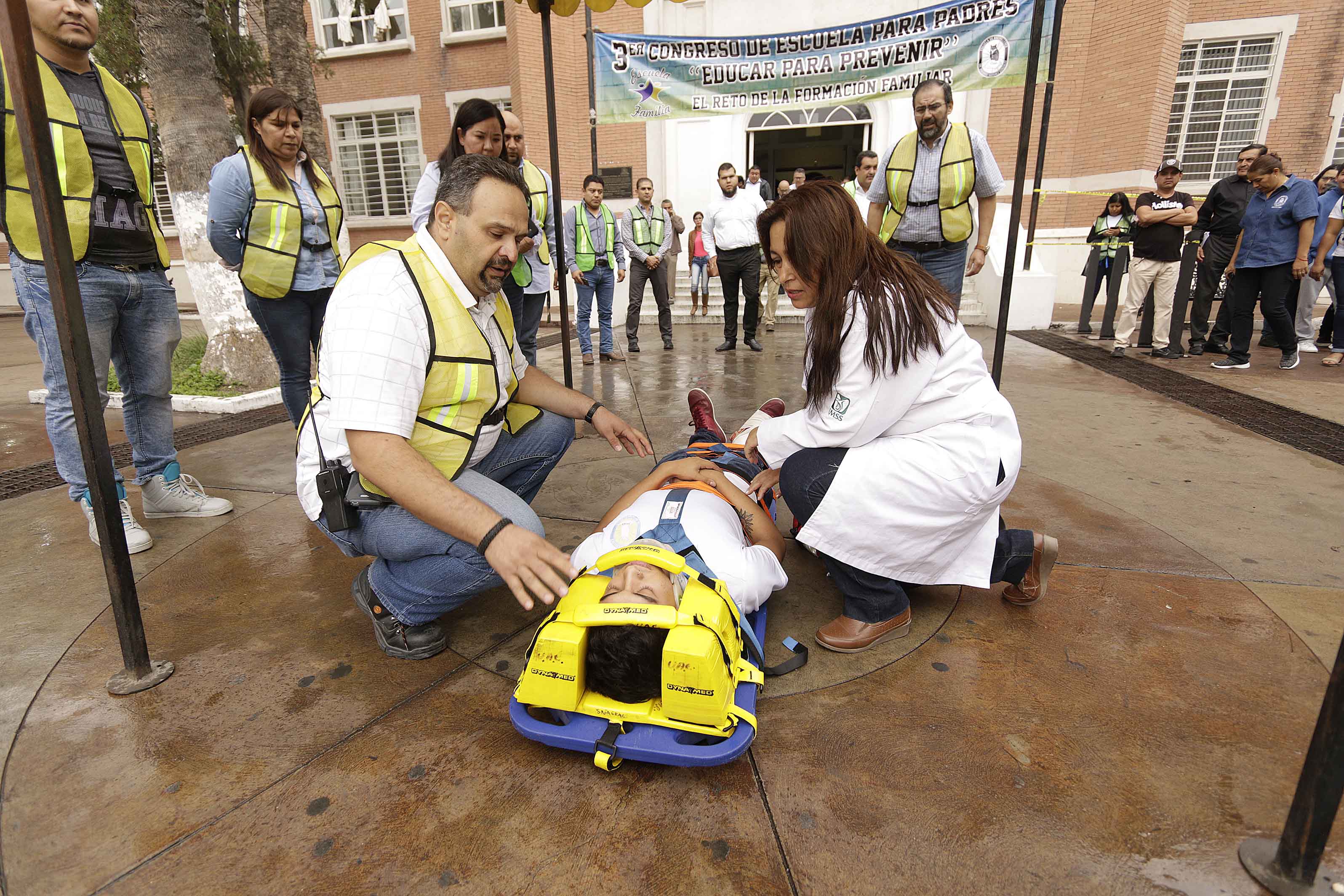 En el simulacro se evacuaron a 872 personas en un lapso de tres minutos con 38 segundos; se contó con la participación de 50 brigadistas para desalojar los 26 salones, una biblioteca, auditorio, laboratorios, baños y cafetería de la preparatoria Mariano Narváez.