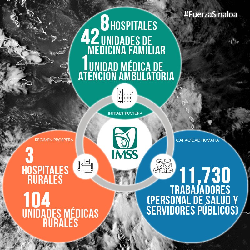 En Sinaloa, el Seguro Social cuenta con más de 11 mil trabajadores, 8 hospitales, 42 clínicas familiares y una Unidad Médica de Atención Ambulatoria en su régimen ordinario. Adicionalmente, a través del Programa IMSS-PROSPERA tiene 3 hospitales rurales y 104 Unidades Médicas Rurales.
