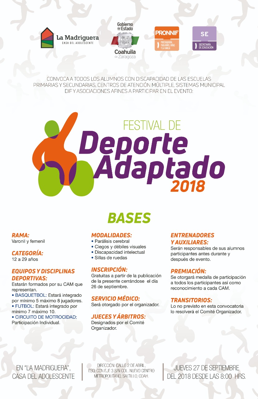 El Gobierno del Estado de Coahuila, a través de la Procuraduría para Niños, Niñas y la Familia (PRONNIF), La Madriguera y la Secretaría de Educación (SE), convocan a los niños y adultos con discapacidad a participar en este festival organizado especialmente para ellos, informó Jorge Chávez, director de dicho espacio.