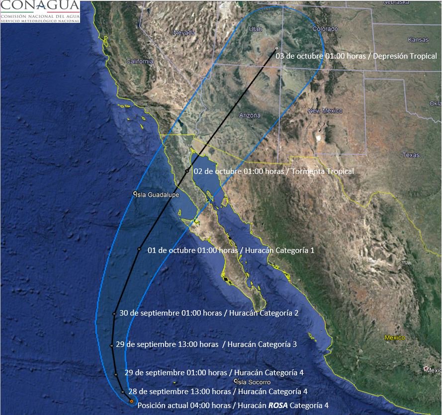 El organismo mantiene su pronóstico previo de que «Rosa» se enfile hacia la península y toque tierra en el estado de Baja California el 1 de octubre próximo, aunque ya degradado a una tormenta tropical.