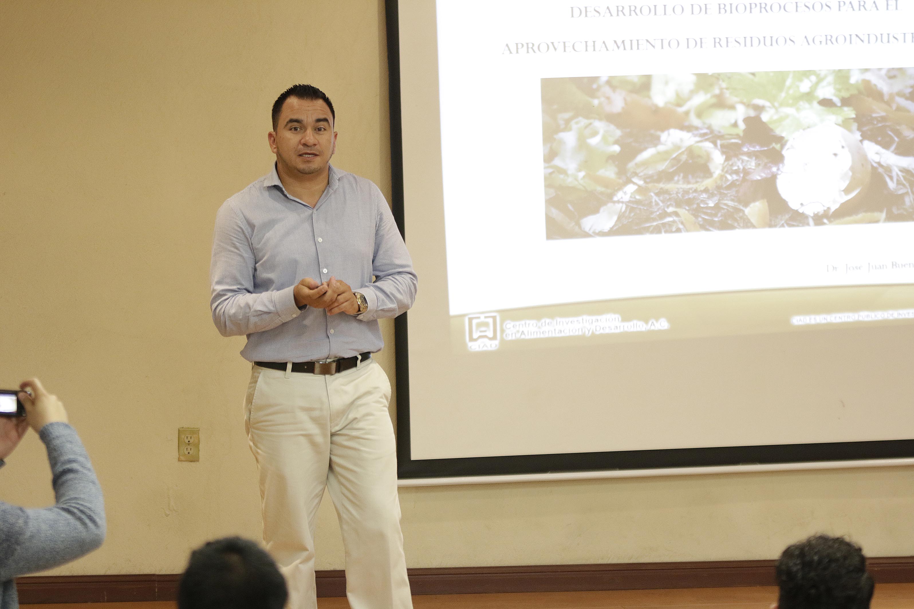 El ciclo de conferencias inició con la charla titulada “Desarrollo de bioprocesos para la valorización de residuos agroindustriales”, a cargo del Dr. José Juan Buenrostro Figueroa, profesor investigador adscrito al CIAD Unidad Delicias, Chihuahua.