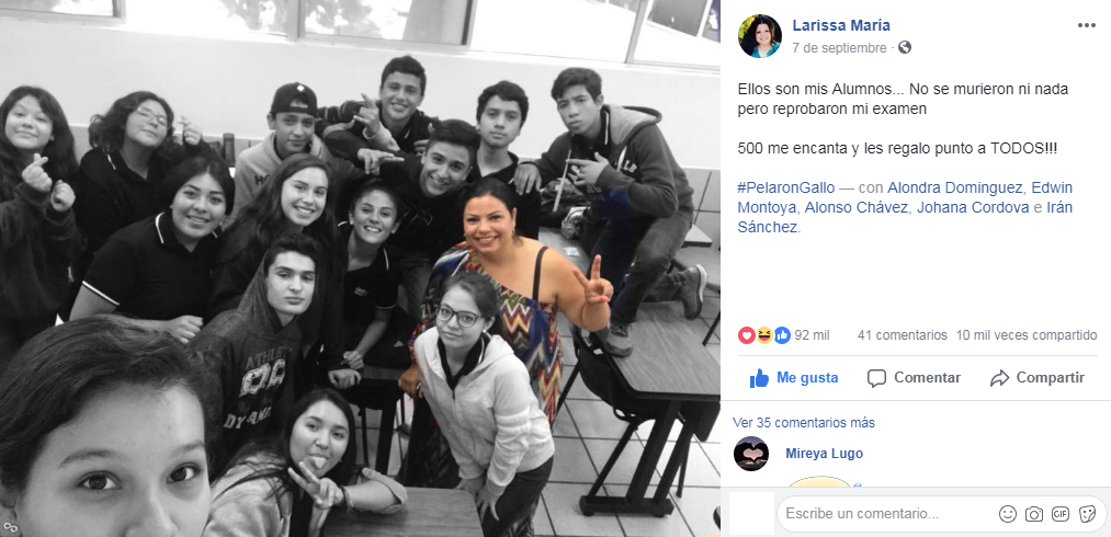En el módulo anterior sus 15 alumnos del primer grado sección D de Bachillerato de la Universidad Autónoma del Noreste (UANE) le pidieron la oportunidad de ganarse un punto extra de calificación en su clase de Álgebra 1 mediante un reto que involucrara el uso de redes sociales, contrario a su estilo estricto aceptó y pidió a los jóvenes conseguir en un lapso de una hora clase 500 reacciones de Facebook o “me encanta” en una fotografía colocada por ella en la red social.