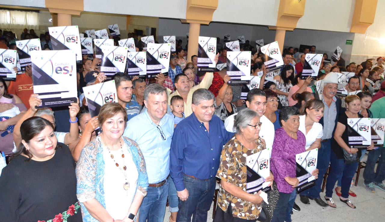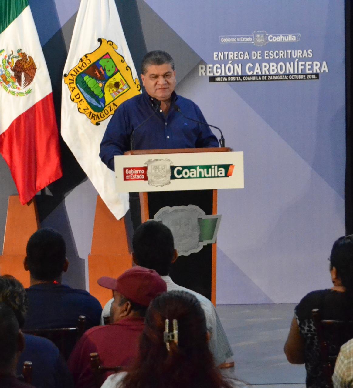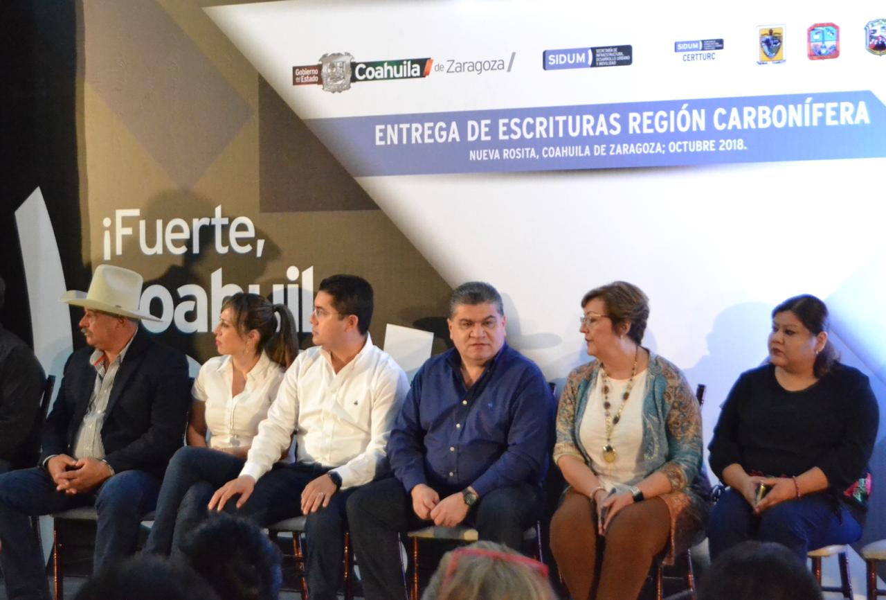 San Juan de Sabinas.- “Ustedes ya son dueños de su pedazo de tierra, de su hogar” expresó el Gobernador Miguel Ángel Riquelme Solís al entregar 528 Escrituras a familias de los de los municipios de San Juan de Sabinas, Múzquiz, Sabinas y Progreso.