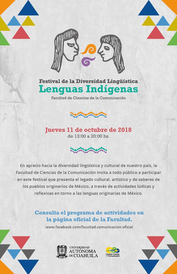 La Facultad de Ciencias de la Comunicación de la Universidad Autónoma de Coahuila, invita a la comunidad en general a asistir y participar en el Festival de la Diversidad Lingüística: Lenguas Indígenas de México, que se estará realizando el jueves 11 de octubre de 1:00 de la tarde a las 20:00 horas, en las instalaciones del plantel.