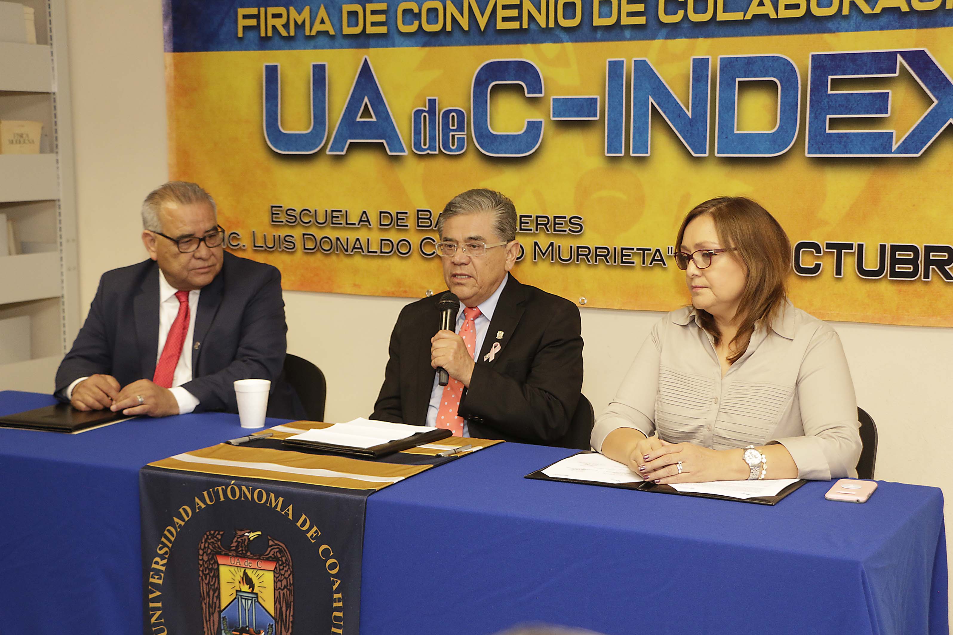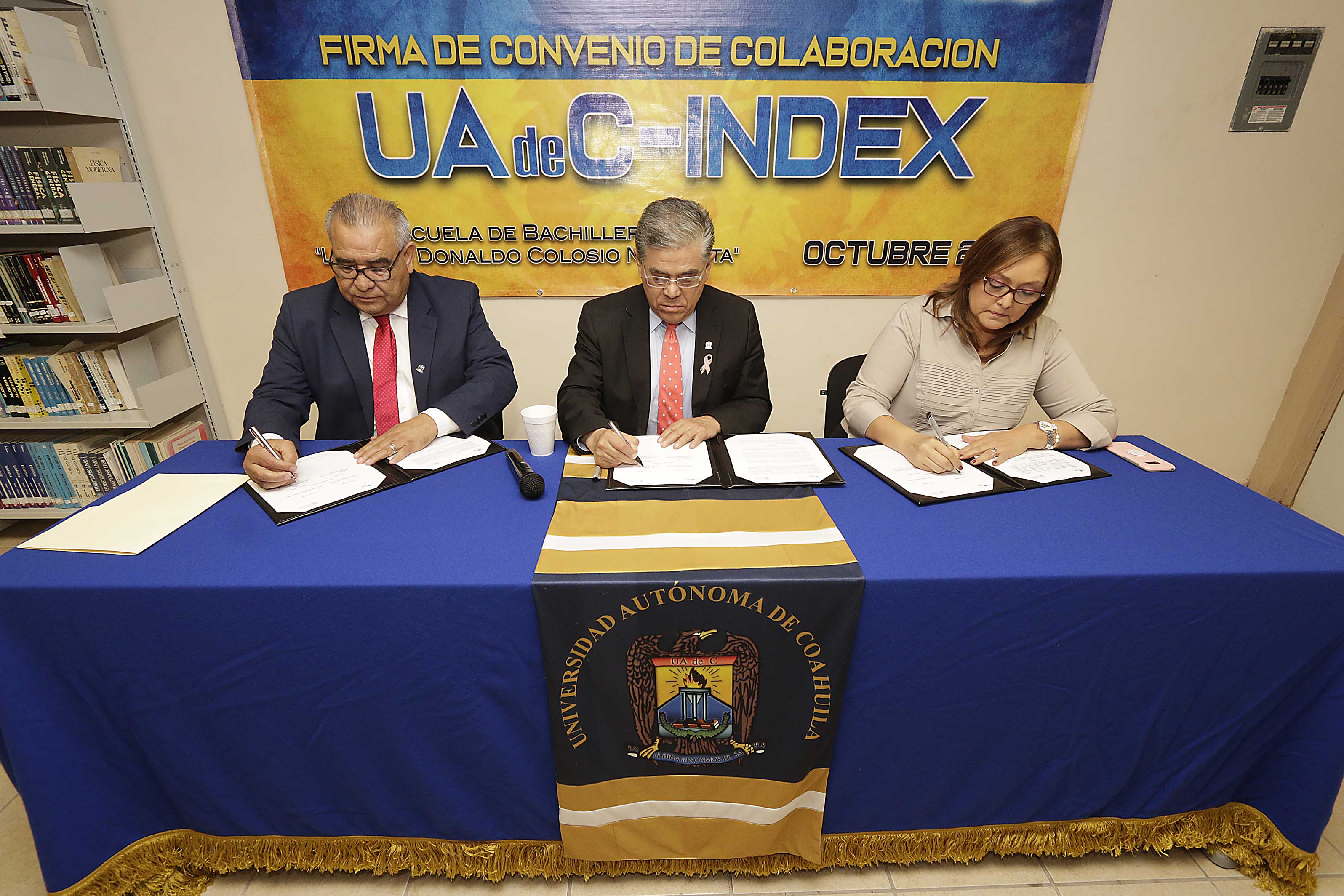 Signaron el documento, el rector de la máxima casa de estudios, Salvador Hernández Vélez, el coordinador de la Unidad Norte, Javier Toledo, el director de la Escuela de Bachilleres Luis Donaldo Colosio, Raúl Pompa Hernández y la presidenta del Consejo de la Industria Maquiladora y Manufacturera de Exportación Index, de Piedras Negras, Blanca Irma Tabares García.