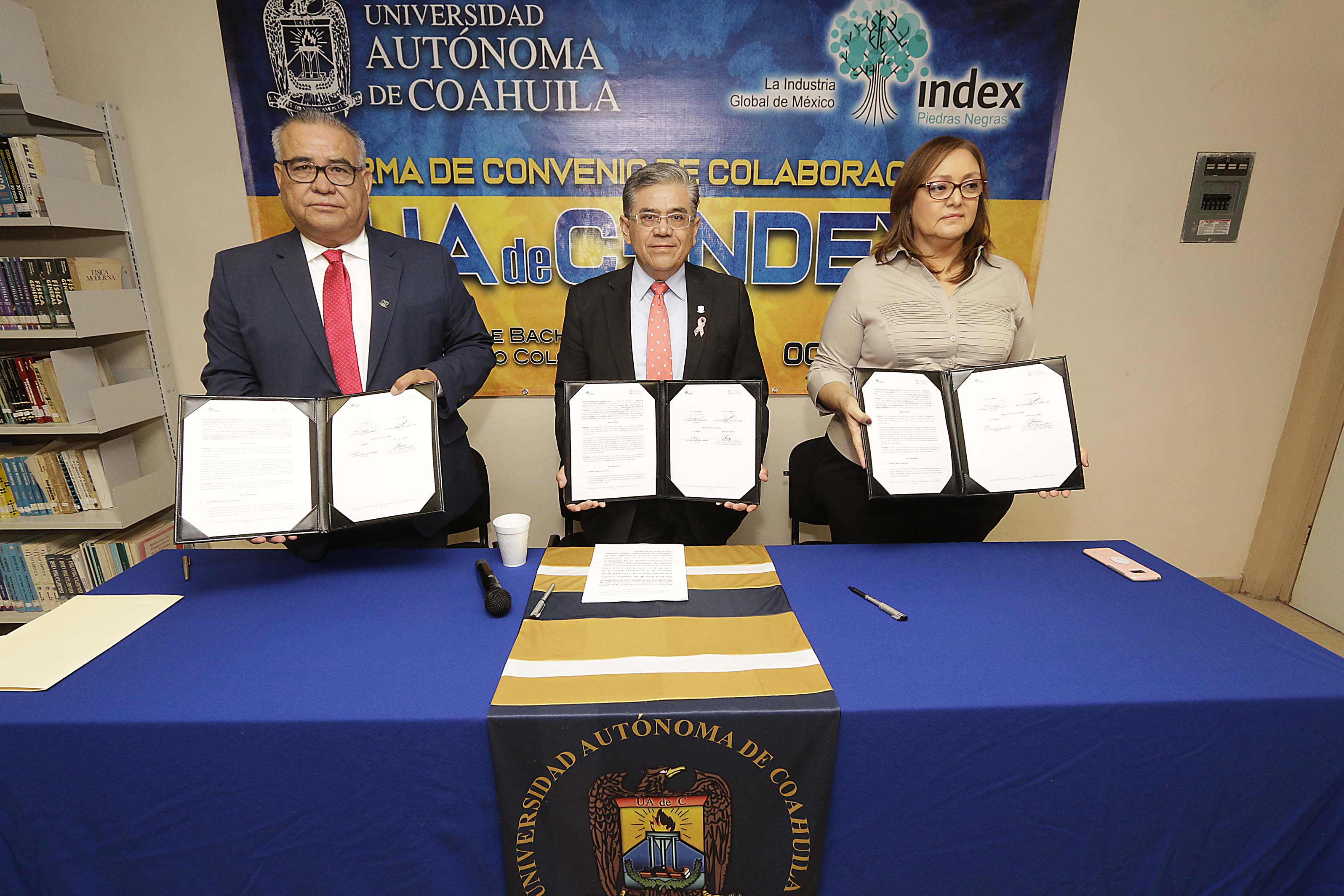 Piedras Neras.- Para fortalecer la vinculación con los diversos sectores de la comunidad, la Universidad Autónoma de Coahuila firmó un convenio de colaboración con el Consejo de la Industria Maquiladora y Manufacturera de Exportación del municipio de Piedras Negras, con el objetivo de ofrecer a trabajadores de la industria la oportunidad de terminar sus estudios de nivel medio superior.