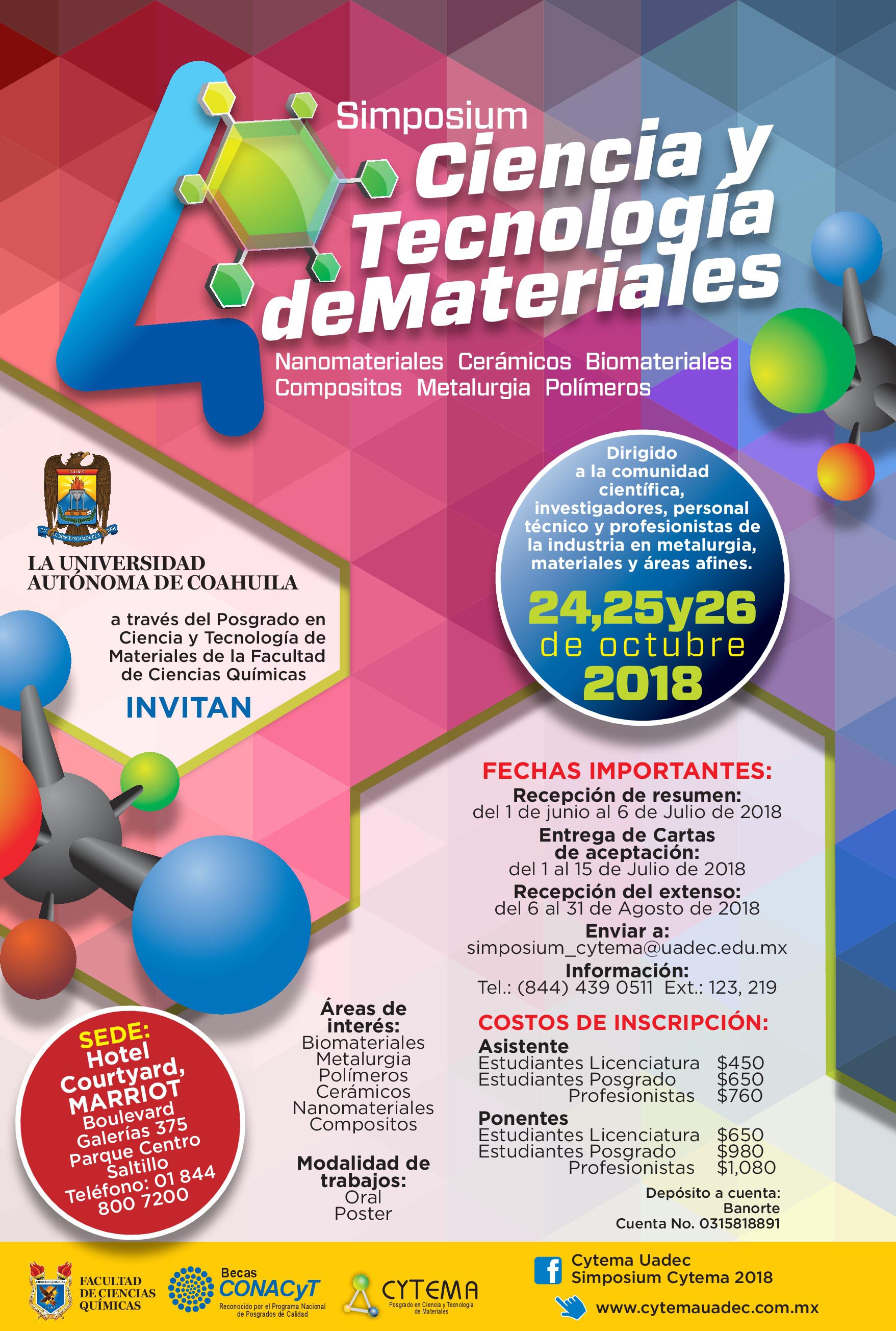 La Facultad de Ciencias Químicas de la Universidad Autónoma de Coahuila, a través del Posgrado en Ciencia y Tecnología de Materiales, invita a la comunidad científica, estudiantes, investigadores, personal técnico y profesionistas de la industria en metalurgia, materiales y áreas afines a participar en el 4o Simposium de Ciencia y Tecnología de Materiales.