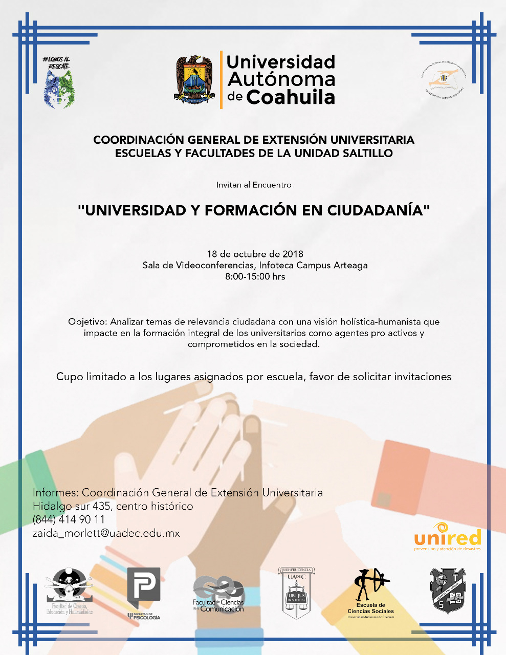 Con el objetivo de analizar temas de relevancia en la formación ciudadana de jóvenes universitarios, la Coordinación General de Extensión Universitaria de la Universidad Autónoma de Coahuila, invita al encuentro “Universidad y Formación en Ciudadanía”, que se llevará a cabo el 18 de octubre.