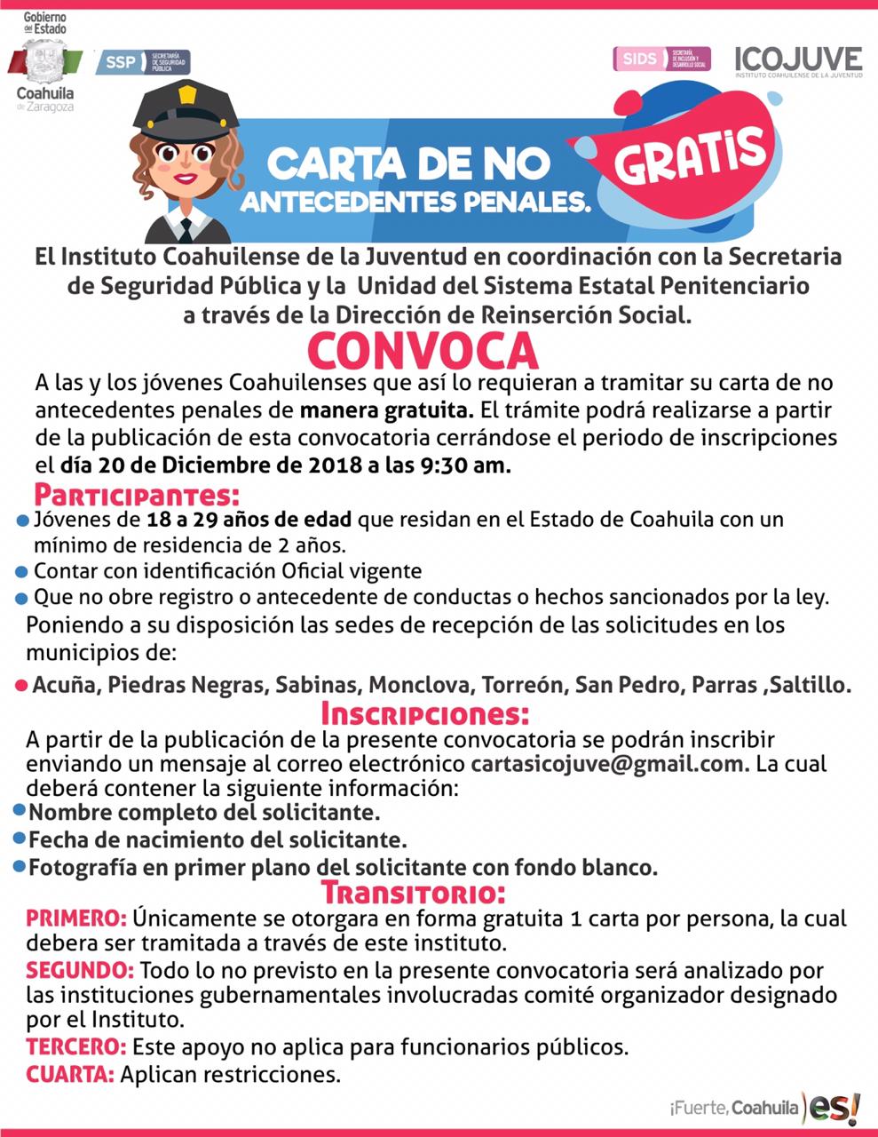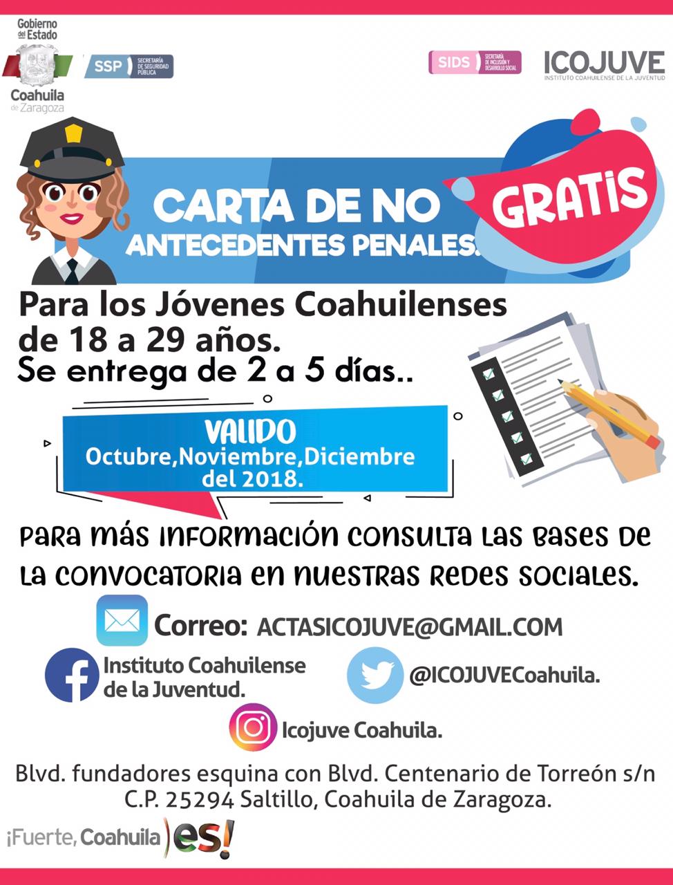 En apoyo a la economía familiar, el Gobierno del Estado, a través del Instituto Coahuilense de la Juventud (ICOJUVE), la Secretaría de Seguridad Pública y la Unidad del Sistema Estatal Penitenciario, ofrecen a jóvenes coahuilenses la oportunidad de obtener gratuitamente la Carta de No Antecedentes Penales.