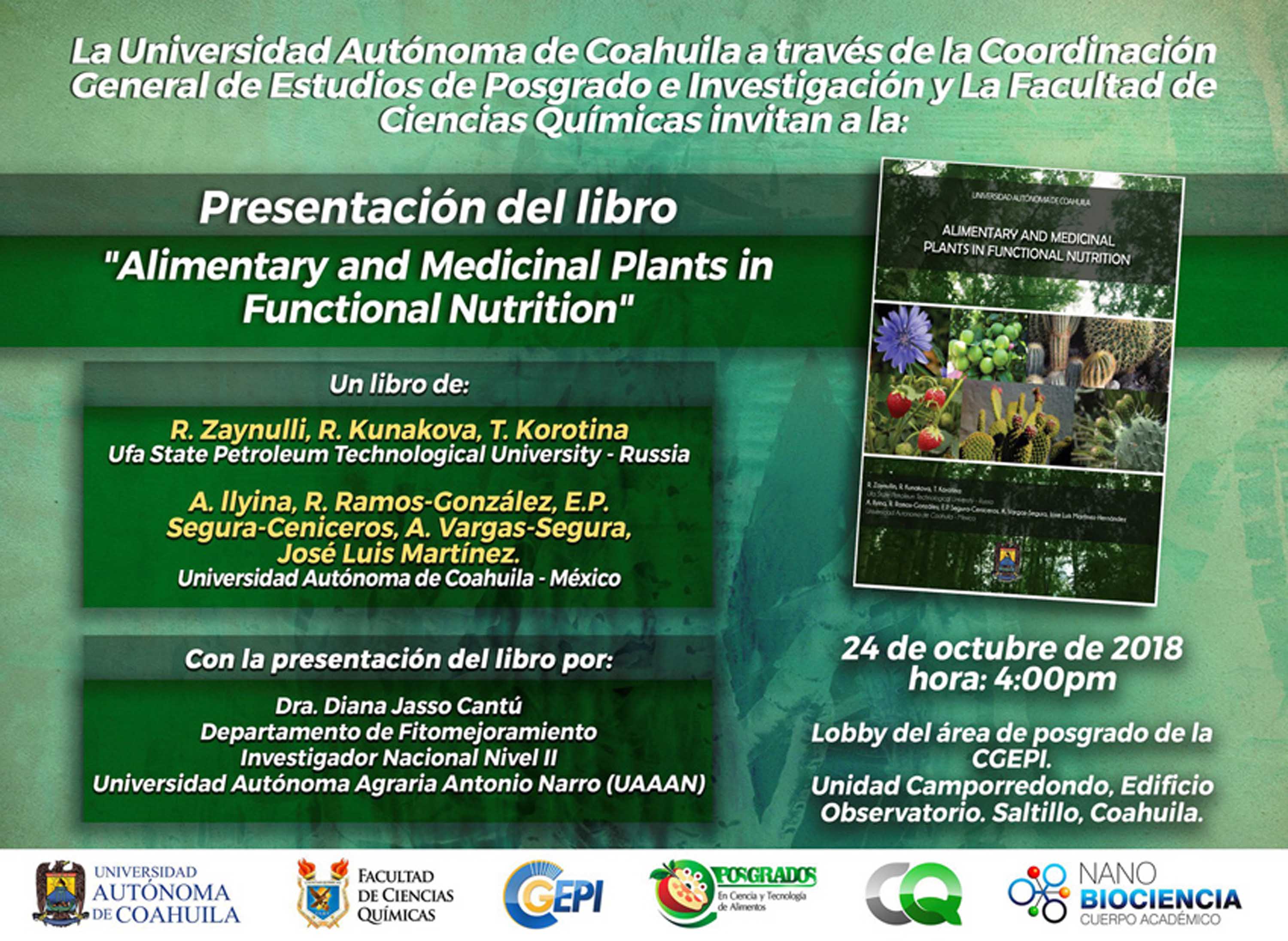 La Coordinación General de Estudios de Posgrado e Investigación CGEPI y la Facultad de Ciencias Químicas de la Universidad Autónoma de Coahuila, invitan a la presentación del libro «Plantas Alimentarias y Medicinales en Nutrición Funcional”.