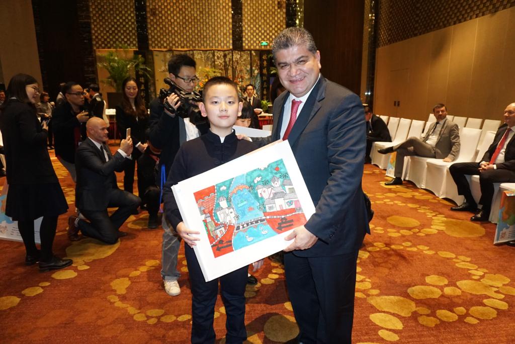 Jiangsu, China.- Niños ganadores del concurso de pintura «Construyendo amistad entre las juventudes del mundo con el pincel», obsequiaron sus trabajos a la delegación comercial de Coahuila encabezada por el gobernador Miguel Ángel Riquelme Solís.