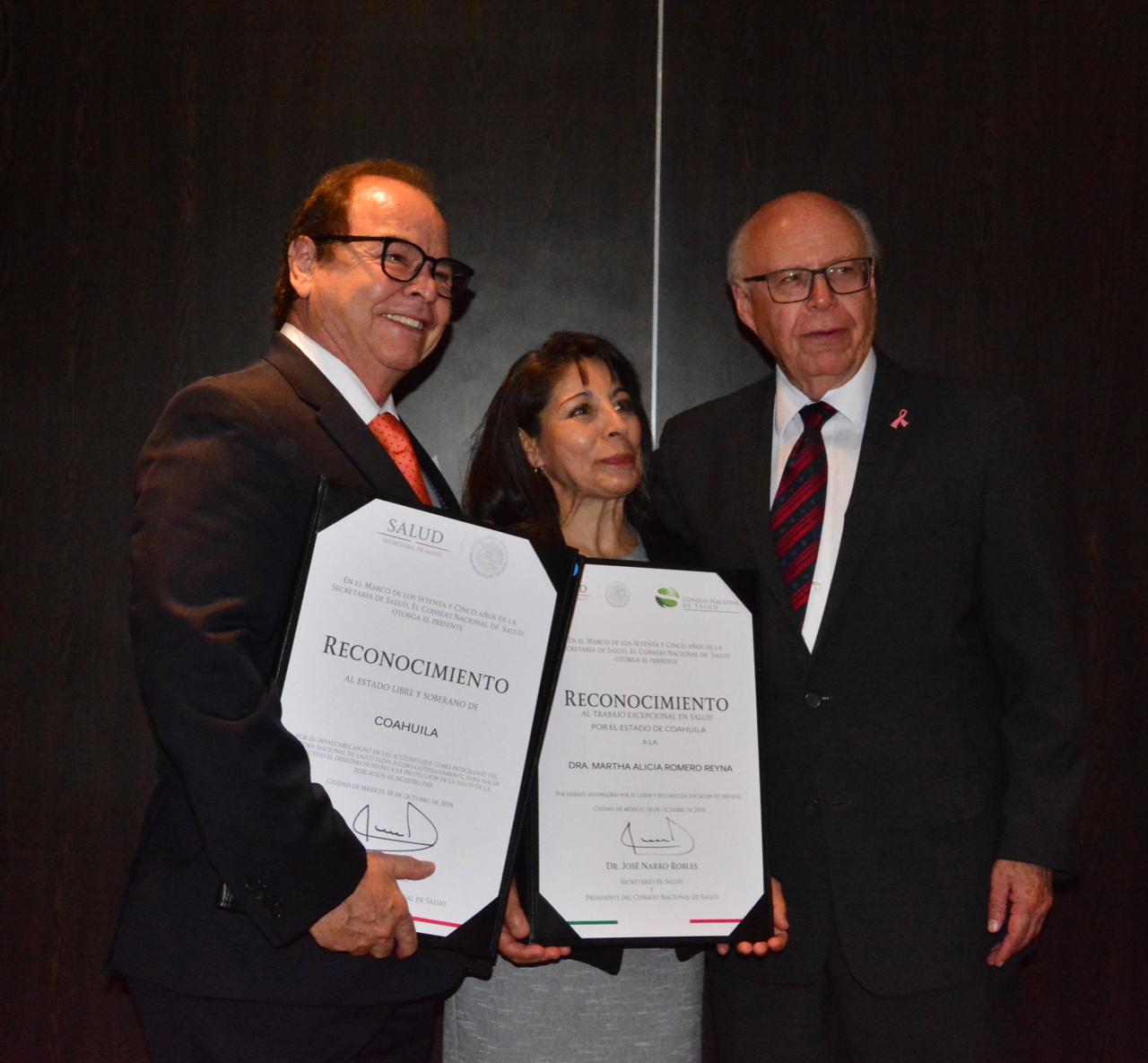 Durante la celebración del 75 Aniversario de la Secretaría de Salud Federal, la subdirectora de Prevención y Promoción de la Salud, Martha Alicia Romero Reyna, recibió un reconocimiento por su trayectoria en Coahuila.