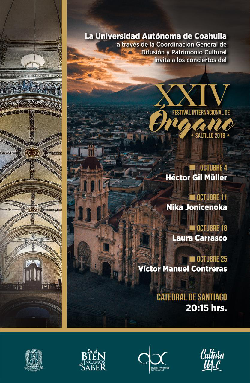 La Universidad Autónoma de Coahuila a través de la Coordinación de Difusión y Patrimonio Cultural, invita al concierto de clausura del XXIV Festival Internacional de Órgano Saltillo 2018 a cargo del Maestro Víctor Manuel Contreras, este jueves 25 de octubre a las 20:15 horas en la Catedral de Santiago.