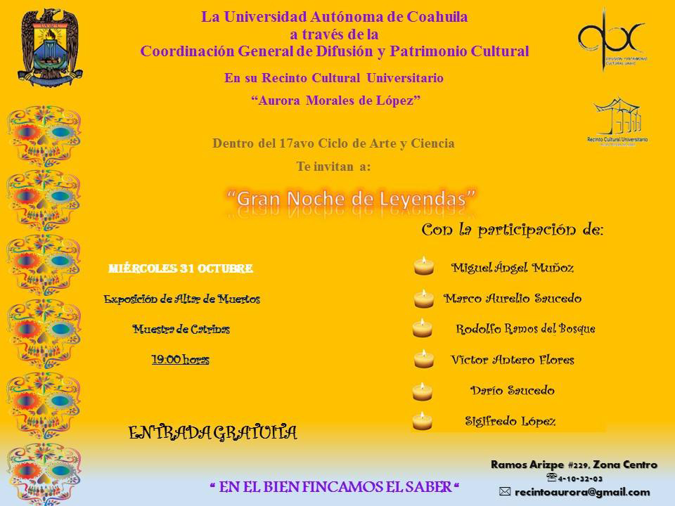 De igual manera, el Recinto Cultural Universitario “Aurora Morales de López”, invita a la comunidad universitaria y público en general a ser partícipes de las actividades con motivo de la celebración del Día de Muertos, a efectuarse el próximo 31 de octubre a partir de las 19:00 horas. Dentro del 17avo Ciclo de Arte y Ciencia.