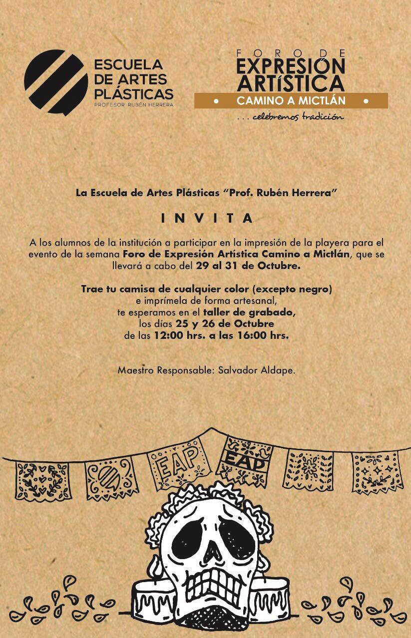 La Escuela de Artes Plásticas, invita a partir del lunes 29 de octubre en Ciudad Universitaria de Arteaga a participar en una verbena que inicia a las 18:00 horas con el Concurso de Catrinas, la exhibición del Altar de Muertos dedicado al pintor Rubén Herrera, las exposiciones “TZOMPANTLI” y “Helow Dead”, además la presentación de la Tuna de la UA de C, así como una venta de comida de temporada, la exhibición de las exposiciones y del altar permanecerá del 29 al 31 de octubre.