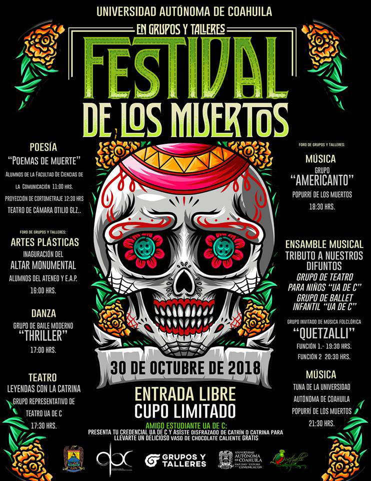 A las 11:00 horas en el Teatro de Cámara “Otilio González” de la UA de C en el sótano de Rectoría por la calle Salvador González Lobo, alumnos de la Facultad de Ciencias de la Comunicación realizarán un recital de poesía “Poemas de Muerte”; a las 12:30 horas se hará la proyección de cortometraje relacionado a la festividad.