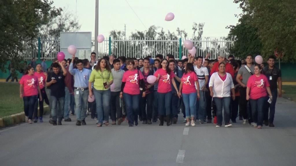 Los alumnos de la Universidad Tecnológica del Norte de Coahuila realizaron posteriormente una caminata de concientización y apoyo a las mujeres que luchan contra esta enfermedad, portando camisetas y globos de color rosa en señal de solidaridad en el Mes de la Prevención del Cáncer de Mama. (EL HERALDO)