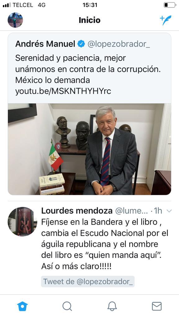 Quien manda aquí es el título del libro que ocupa el primer lugar entre los que está leyendo el presidente electo, Andrés Manuel López Obrador, de acuerdo a una fotografía que él mismo difundió en su cuenta de Twitter. Una usuaria de esa red social lo hizo notar, así como el hecho de que AMLO aparezca al lado de una bandera con el águila republicana, y no la actual bandera de México. (EL HERALDO)
