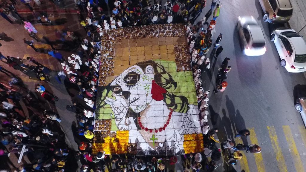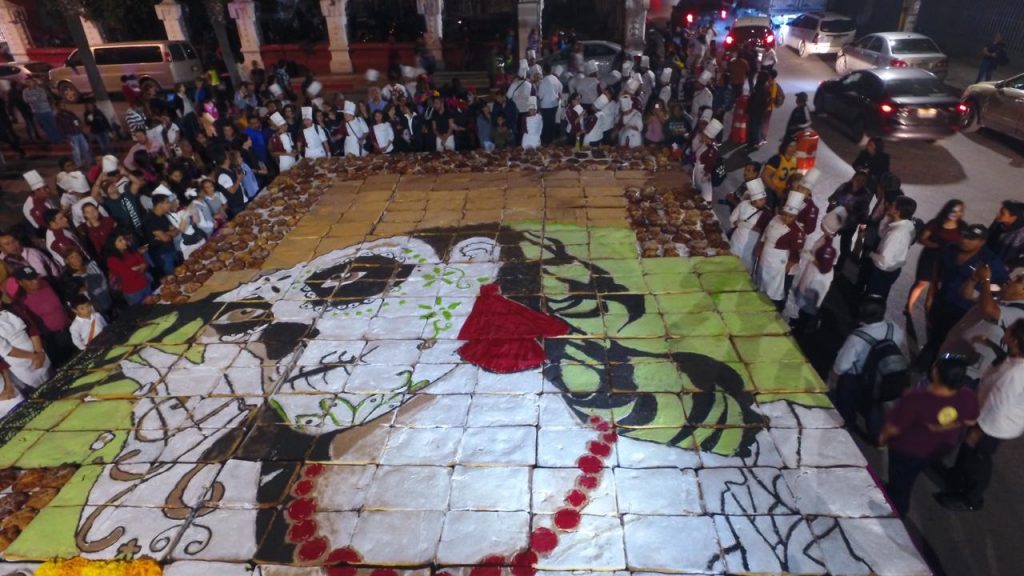 Por primera vez casi 200 estudiantes de la Universidad Vizcaya campus Saltillo de la licenciatura de Gastronomía, elaboraron el monumental pan de muerto que fue degustado por miles de familias en la Alameda durante el festival Ánimas del Desierto.