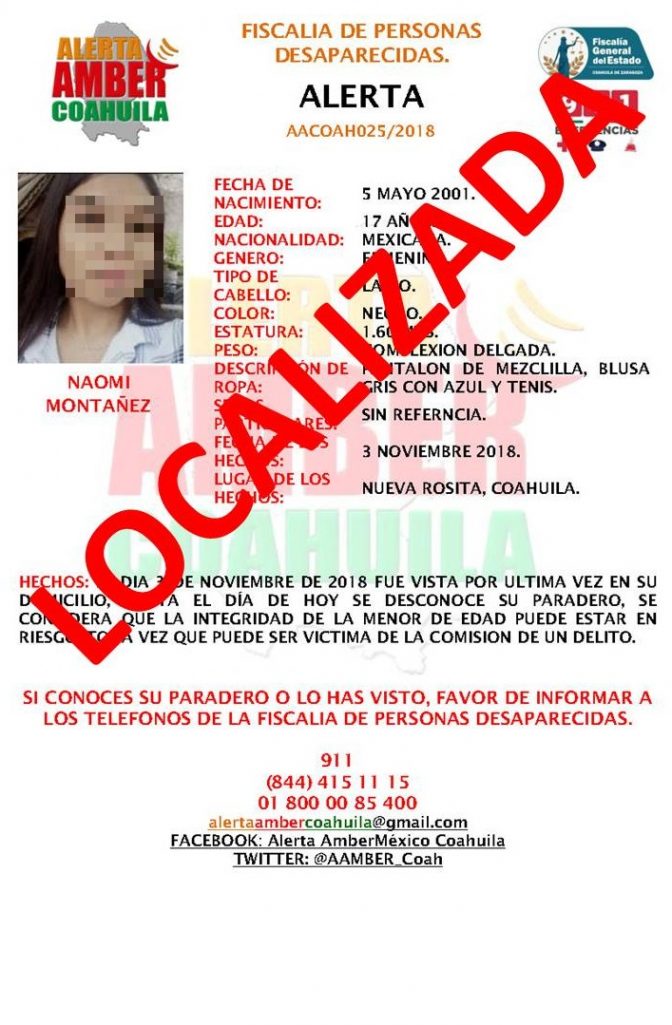 El 3 de noviembre la madre de la menor denunció la desaparición de su hija identificada como Naomi de 17 años. La denunciante comentó que la menor salió del domicilio de su abuela materna ubicado en Nueva Rosita.