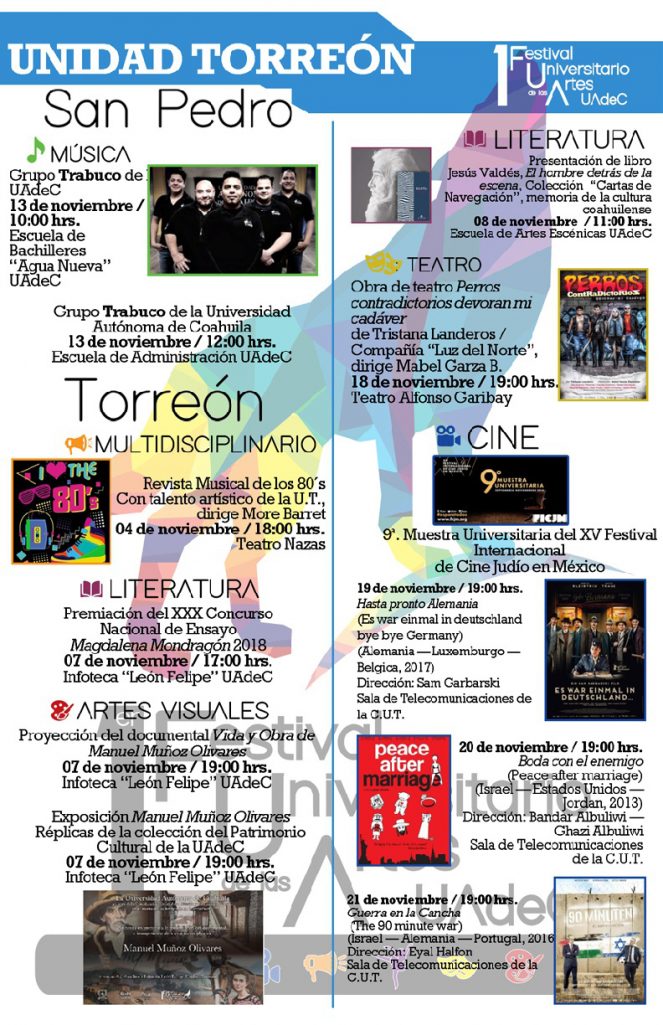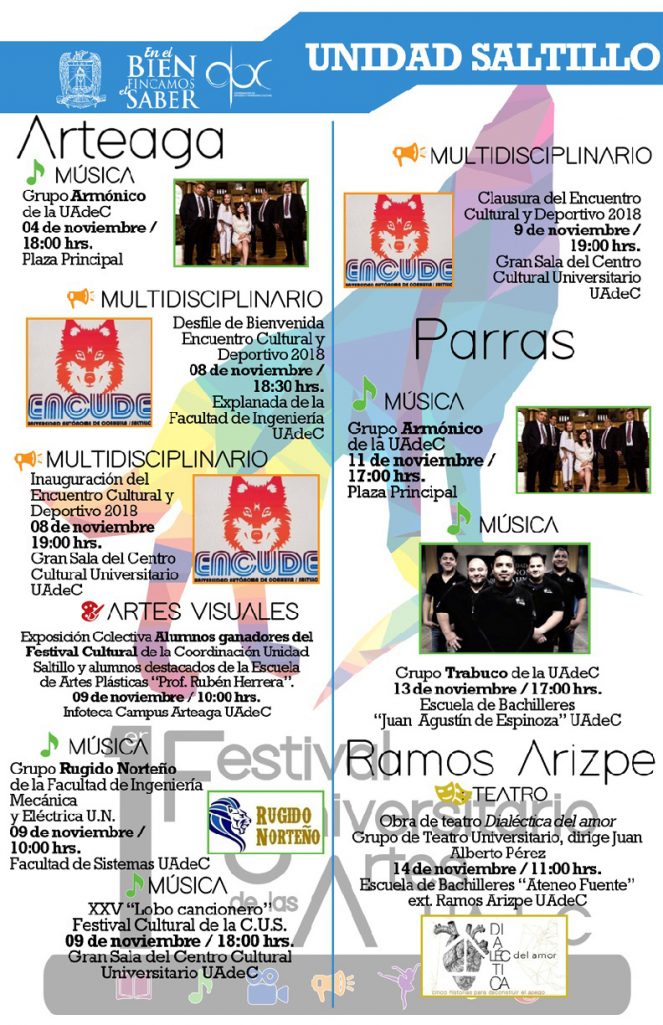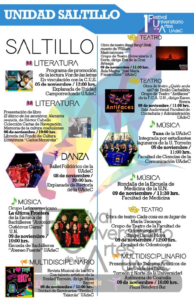 La Universidad Autónoma de Coahuila convoca a la comunidad universitaria y público en general a disfrutar de las actividades del Primer Festival Universitario de las Artes UA de C, que se llevarán a cabo en distintos recintos de las Unidades Saltillo, Torreón y Norte.