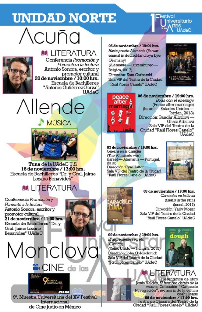 En la Unidad Norte, dentro de la 9° Muestra Universitaria del XV Festival Internacional de Cine Judío en México, el miércoles 7 se proyectará la cinta “Guerra en la Cancha” dirigida por Eyal Halfon; el jueves 8 se proyectará “El Ingrediente Secreto” del director John Goldschmidt. Ambas cintas se presentarán a las 19:00 horas en la Sala VIP del Teatro de la Ciudad “Raúl Flores Canelo” de la UA de C en Monclova.