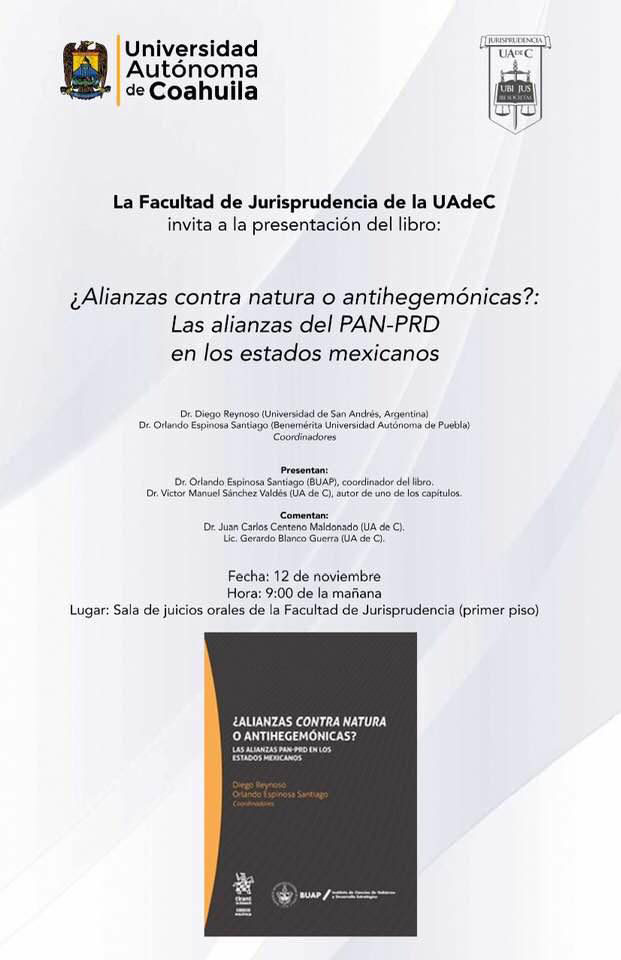 La Facultad de Jurisprudencia de la Universidad Autónoma de Coahuila será sede para la presentación del libro ¿Alianzas contra natura o antihegemónicas? Las alianzas PAN-PRD en los Estados Mexicanos, por lo que invita a la comunidad estudiantil y al público en general a acudir.