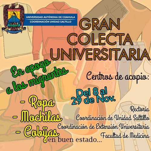 Si tienes ropa, mochilas o cobijas en buen estado que ya no utilices, no las tires y mejor dona a la Colecta que convoca Lobos al Rescate UNIRED de la Universidad Autónoma de Coahuila para apoyar a la Caravana Migrante.