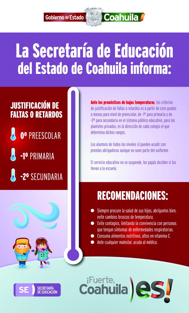 La Secretaría de Educación del Estado (SE), ante las bajas temperaturas que se esperan para esta temporada invernal, reitera los criterios en los que se justifican faltas o retardos.