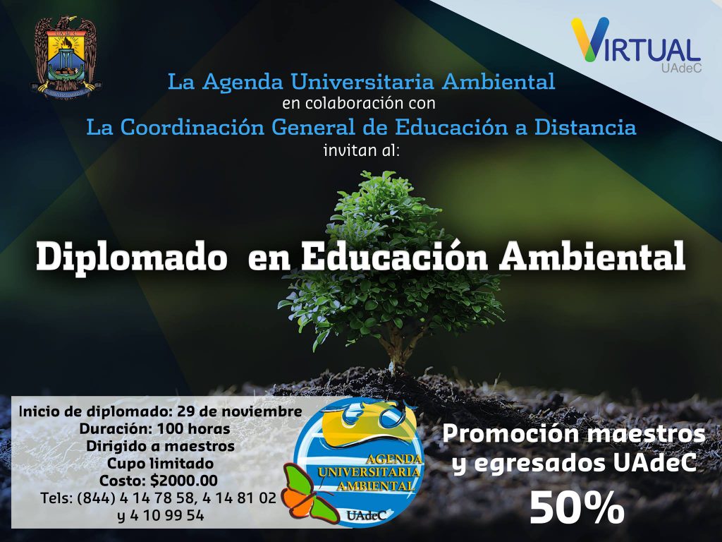 La Agenda Universitaria Ambiental en conjunto con la Coordinación de Educación a Distancia de la Universidad Autónoma de Coahuila, invitan a docentes de la máxima casa de estudios y externos a tomar el Diplomado en Educación Ambiental.