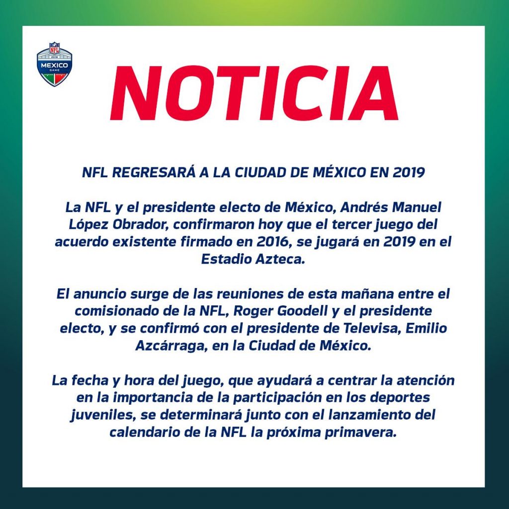 A través de un comunicado, la NFL confirmó que el partido del próximo año se realizará en el mismo estadio Azteca, la fecha será dada a conocer después.