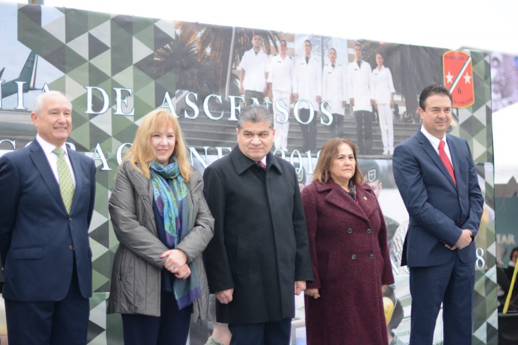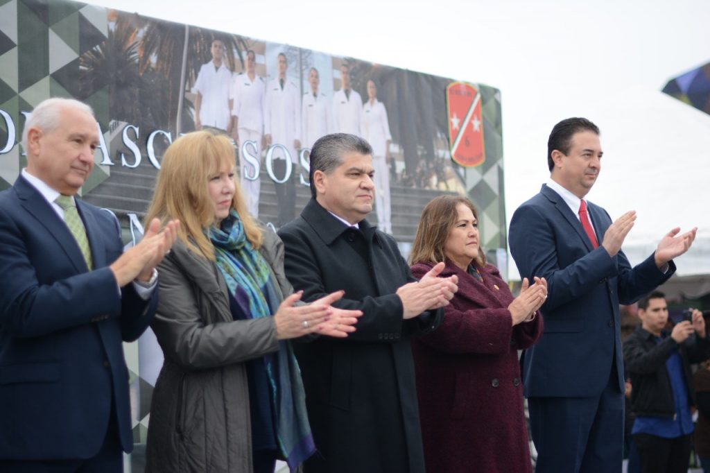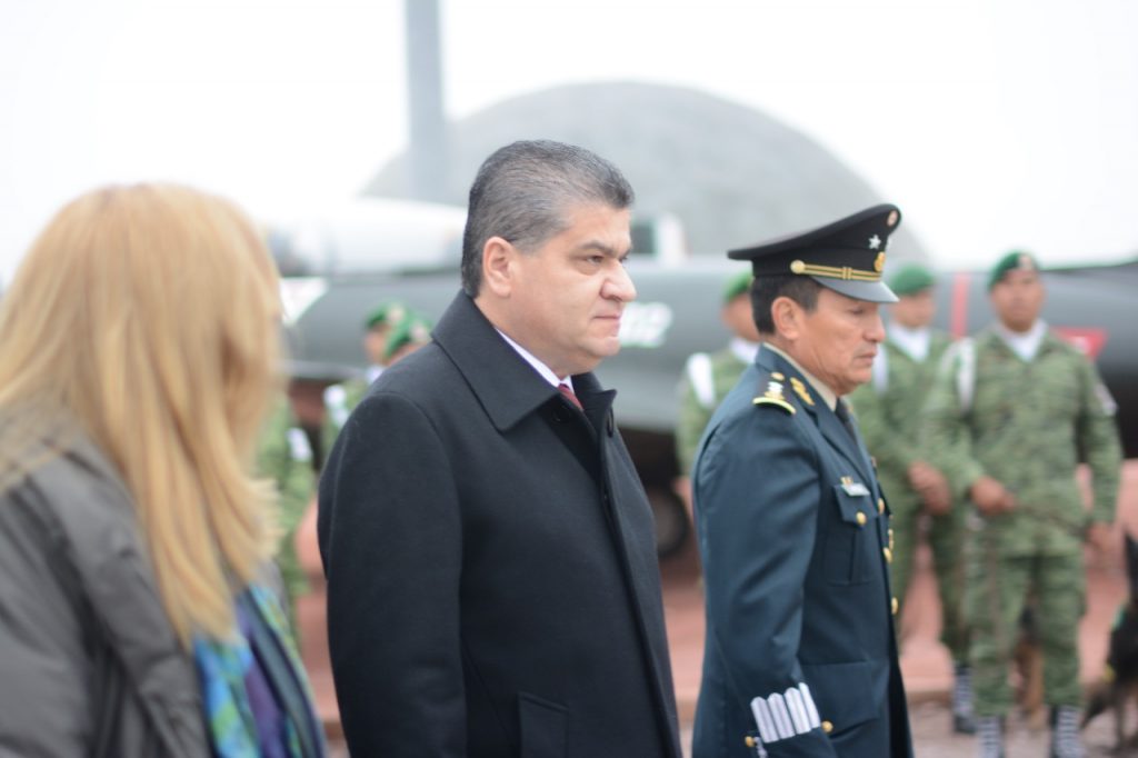 Acompañado del general Raúl David Guillen Altuzar, Comandante de la Onceava Region Militar, general Francisco Ortega Luna, Comandante de la Sexta Zona Militar; Comandante del 105 Batallón de Infantería, Óscar Zavala Barrera; Miriam Cárdenas Cantú, magistrada Presidenta del Tribunal Superior de Justicia; Jaime Bueno Zertuche, presidente de la Junta de Gobierno del Congreso Local; diputada federal Silvia Garza Galván y los alcaldes de Monclova, Alfredo Paredes López,  y de Frontera, Florencio Siller Linaje.