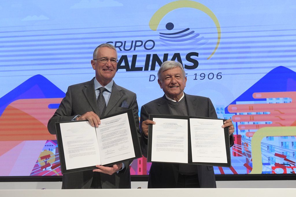 El presidente electo de México, Andrés Manuel López Obrador, y Ricardo Salinas Pliego, presidente de Grupo Salinas, firmaron un convenio para impulsar el programa Jóvenes Construyendo el Futuro.