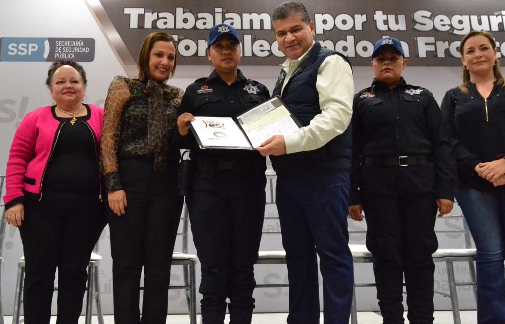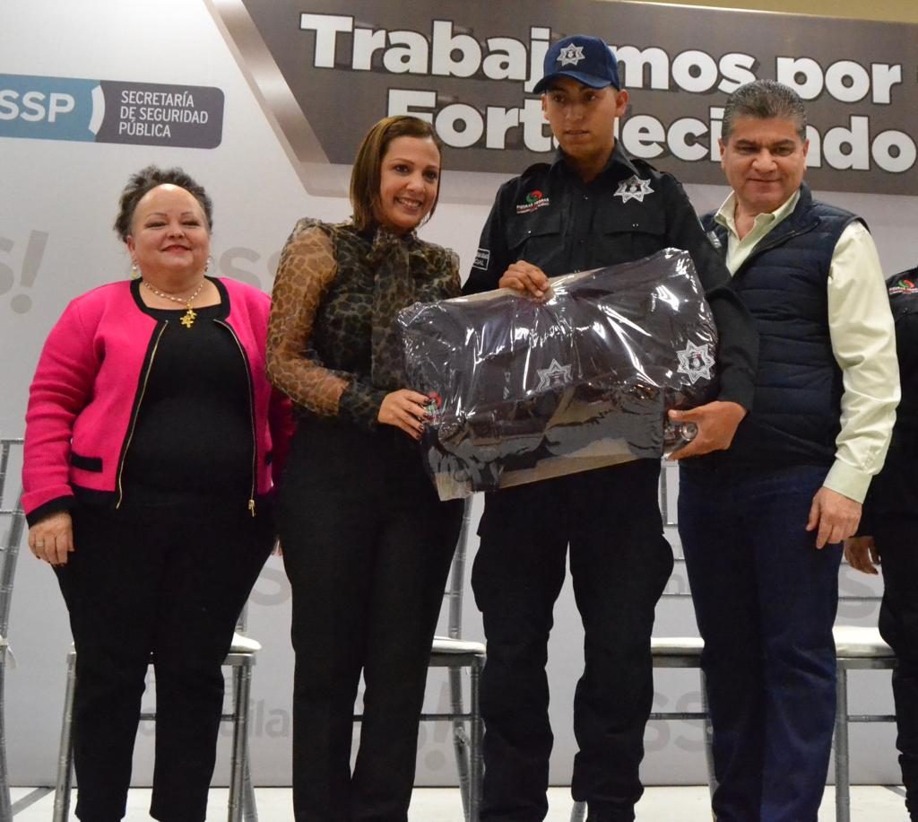 Los oficiales recibieron también equipo que incluyó camisas, pantalones, botas, lámparas, impermeables, fornituras, kit de primer respaldo, cámara fotográfica y gorras, además de chamarras y chalecos antibalas, con inversión total de un millón de pesos.
