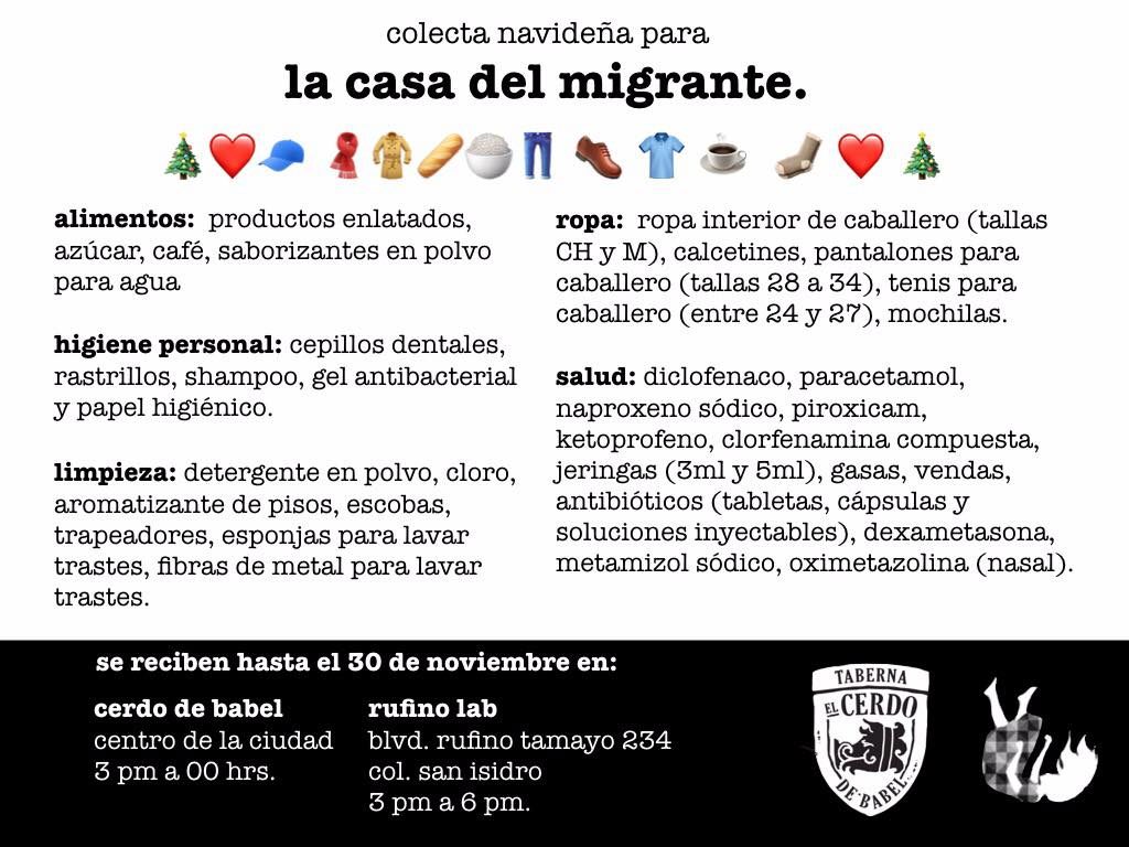 «Por iniciativa de amigos de El Cerdo que pidieron que el espacio se habilitara como centro de acopio, fue que surgió esta iniciativa. Inició esta semana y la vamos a llevar a cabo hasta el día 30 de noviembre. Ya en otros años hemos hecho colectas para la Casa del Migrante, porque es como la temporada más difícil para ellos, en cuestión de alimentación, de ropa», platicó Sergio Castillo Lara, propietario de El Cerdo de Babel, en entrevista para El Heraldo.