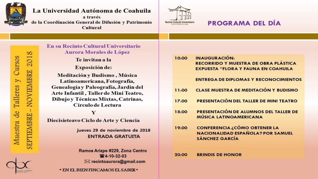 La Universidad Autónoma de Coahuila, a través de la Coordinación General de Difusión y Patrimonio Cultural, invita a la muestra de talleres y cursos semestrales del Recinto Cultural “Aurora Morales de López”.