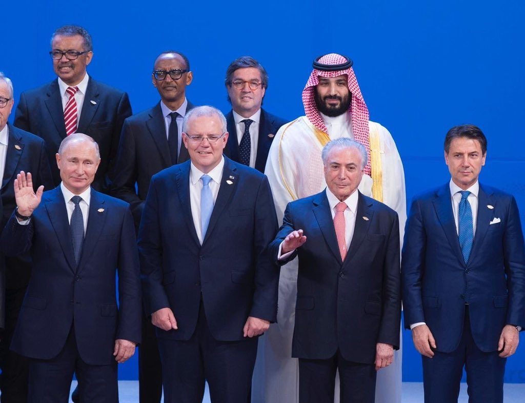 En la primera fila estuvieron los presidentes de Estados Unidos, Donald Trump; Rusia, Vladimir Putin; Francia, Emmanuel Macron; Sudáfrica, Cyril Ramaphosa; Turquía, Recep Tayyip Erdogan; México, Enrique Peña Nieto; y Brasil, Michel Temer; así como la primera ministra de Reino Unido, Theresa May; el de Italia, Giuseppe Conte; y el de Singapur, Lee Hsien Loong.