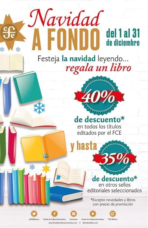 La Librería del Fondo de Cultura Económica Carlos Monsiváis (Ramos Arizpe 871. Centro Histórico), celebra la época decembrina con grandes descuentos que incluyen el 40 por ciento en todos los títulos editados por el FCE y hasta un 35 por ciento menos en sellos seleccionados.