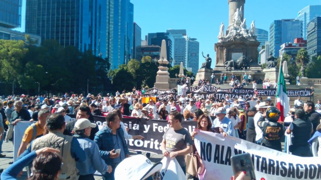 Luego de partir de la columna de la Independencia, luego de las 11:00 horas de este domingo, la manifestación arribó casi al mediodía al monumento a la Revolución, donde María Elena Herrejón, a la cabeza de la movilización y dirigente de Movimiento Pro-Vecino, A. C., manifestó su desconfianza por los señalamientos de López Obrador de que No nos va a fallar, pero “qué creen -indicó-, nos falla”.