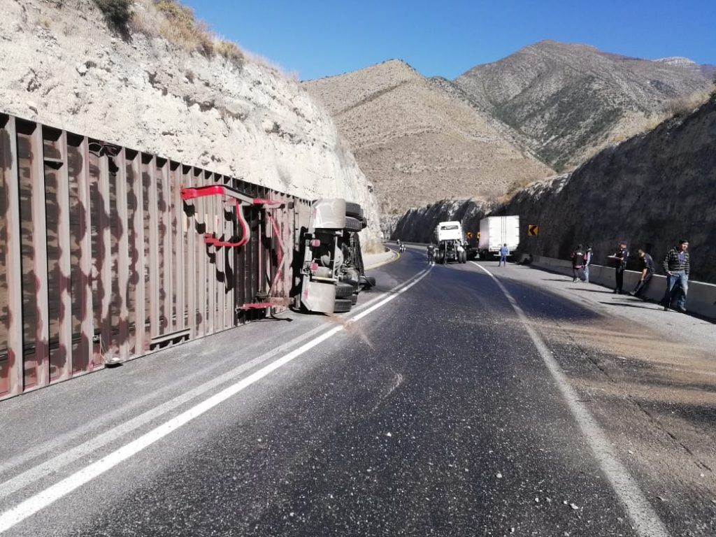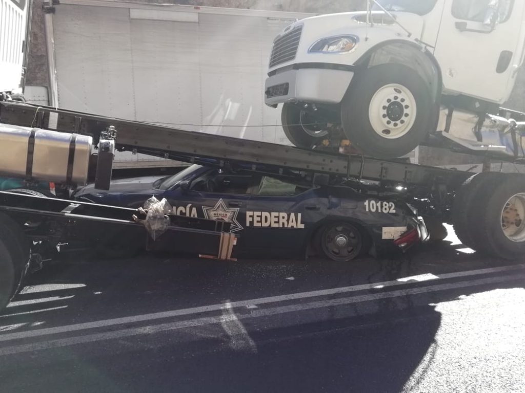 Arteaga-. Un trailero aplastó con su pesada unidad una patrulla de la Policía Federal en la carretera a México, en el tramo de «Los Chorros».