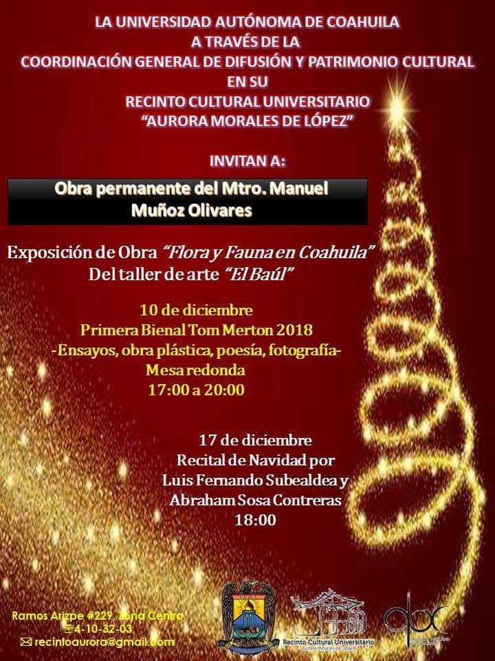 El Recinto Cultural Universitario «Aurora Morales de López» (Ramos Arizpe 229. Centro Histórico) abrirá sus puertas para recibir sus dos últimos eventos del año. El primero lleva por título Primera Bienal Tom Merton 2018, a realizarse el 10 de diciembre a partir de las 5:00 de la tarde, mismo que girará en torno a los ensayos, obra plástica, poesía y fotografía del religioso y activista francés que da nombre al imperdible momento.