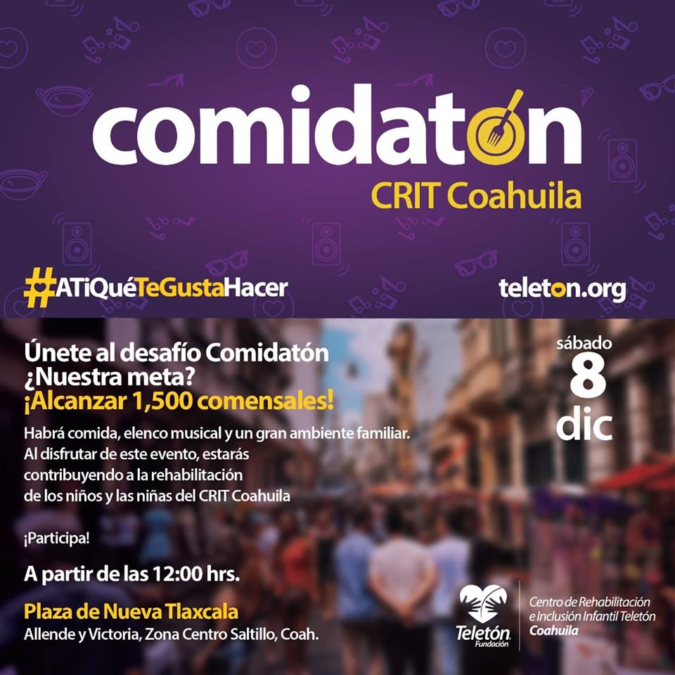 Siempre con la intención de apoyar a esta noble campaña, la sede en la entidad realizará este sábado a partir de las 12:00 del mediodía un evento denominado Comidatón CRIT Coahuila, destinado a vender al menos mil 500 porciones de antojitos mexicanos como enchiladas, tamales, taquitos de trompo, birria, burritos, hot dogs, postres, por mencionar algunos, para obtener una suma económica destinada íntegramente a la causa Teletón.