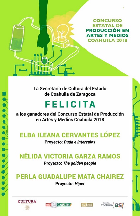 De acuerdo a los criterios de evaluación y en coherencia con la convocatoria, el fallo otorga el apoyo a los siguientes proyectos: “Duda e intervalos”, presentado por Elba Ileana Cervantes López; “The golden people”, presentado por Nélida Victoria Garza Ramos, y “Híper”, presentado por Perla Guadalupe Mata Chairez.