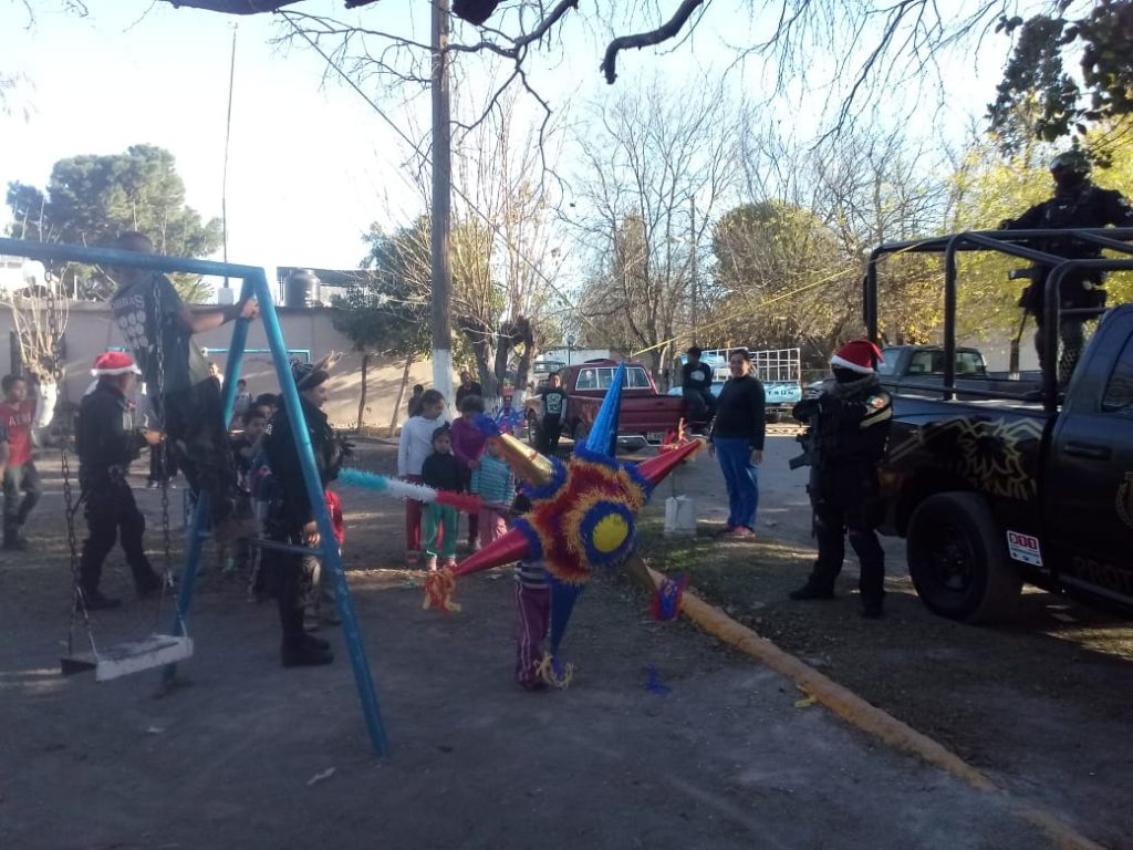 En una plaza pública de Sabinas, inclusive organizaron una posada con los niños que jugaban en los aparatos deportivos y columpios. Fueron sus propios padres quienes acercaron a los pequeños al festejo, que dejó rostros de alegría cuando recibían un regalo de parte de Fuerza Coahuila.