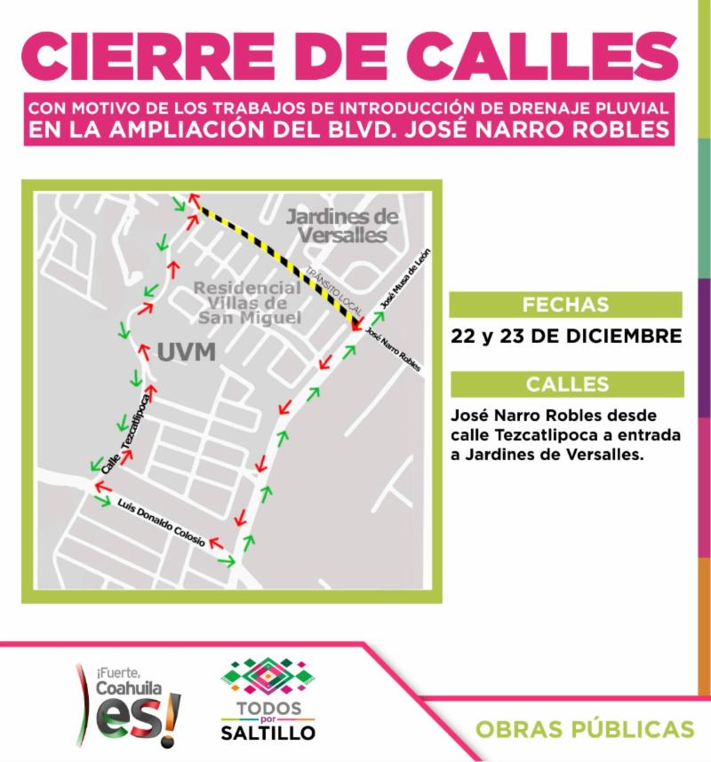 El Gobierno Municipal de Saltillo, a través de la Dirección de Infraestructura y Obras Públicas, informa que los días 22 y 23 de diciembre permanecerá cerrado a la circulación un tramo del bulevar José Narro Robles con motivo de los trabajos de modernización y ampliación de esta vialidad.